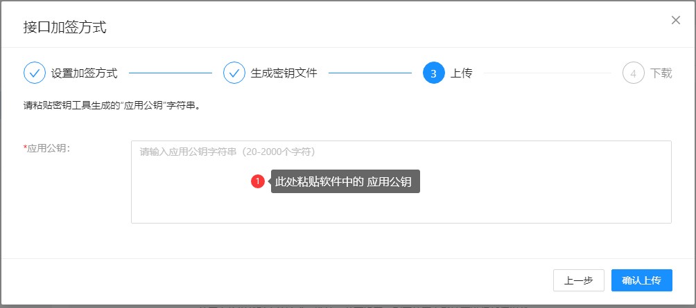 7.复制软件生成的【应用公钥】粘贴到网页中,点击网页中的确认上传按钮进入下一步