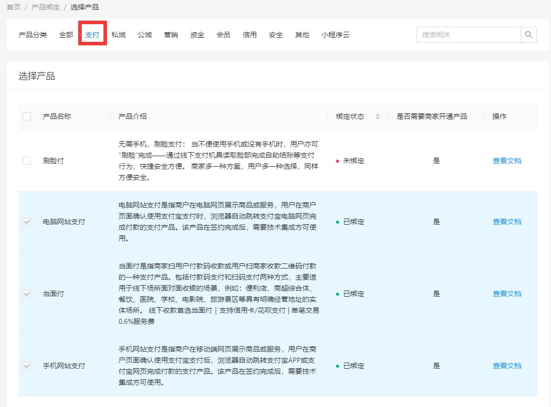 10.进入产品绑定,选择支付,勾选当面付或电脑网站支付+手机网站支付