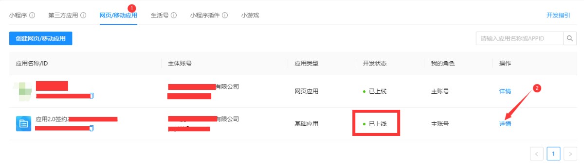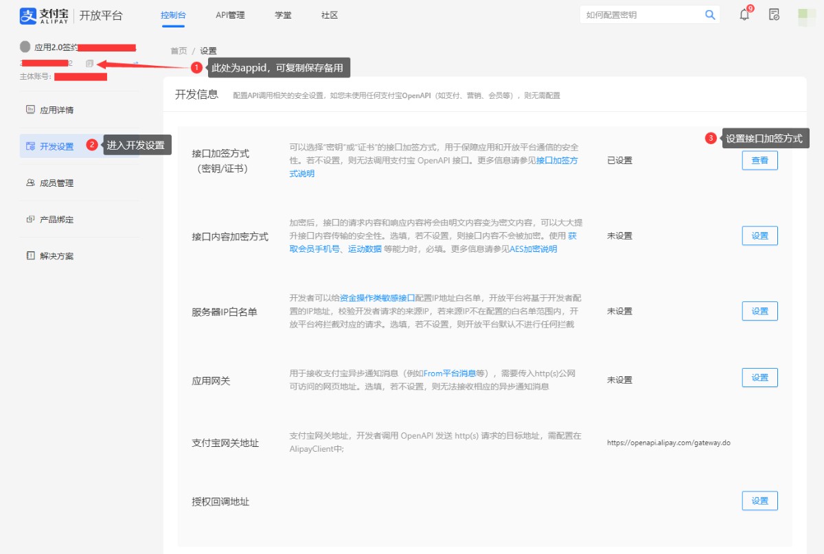 3.创建好应用或直接有基础应用的,点击详情进入配置页面,可以先复制APPID保存备用,进入开发设置,设置接口加签方式