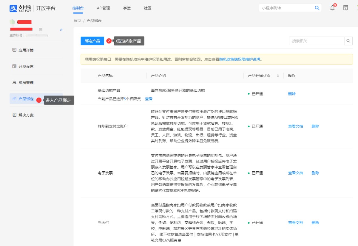 11.进入 支付宝商家平台 绑定APPID appid为第3步时保存备用的APPID
