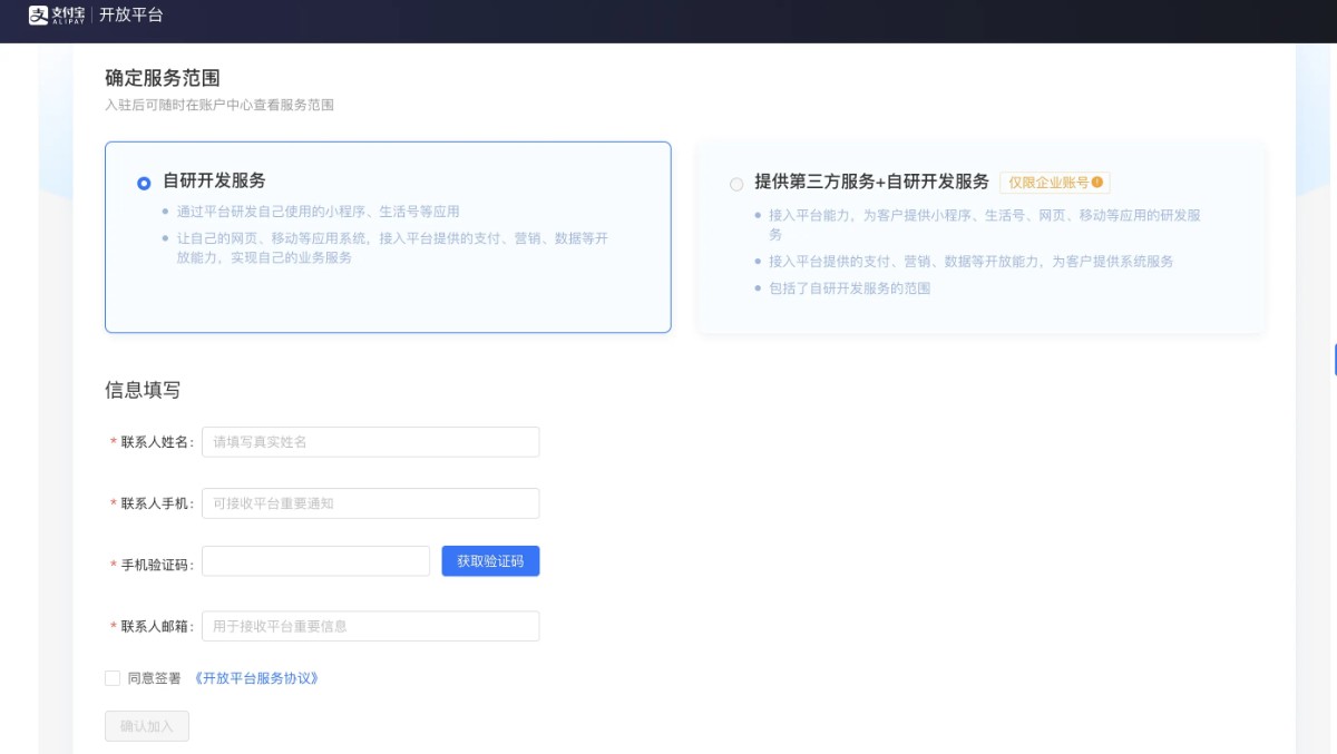 2.权限开通成功后登录 支付宝开放平台 进入控制台,网页/移动应用,一般会默认生成一个基础应用,如果没有就自行创建一个网页应用,如首次登录开放平台,需要先填写开发者信息,个人开发者请选择第一个“自研开发服务”,企业账号及公司账号可选择第二种。两种都可使用,根据您的个人需求选择。建议普通用户选择第一种“自研发开服务”,申请简单快捷。